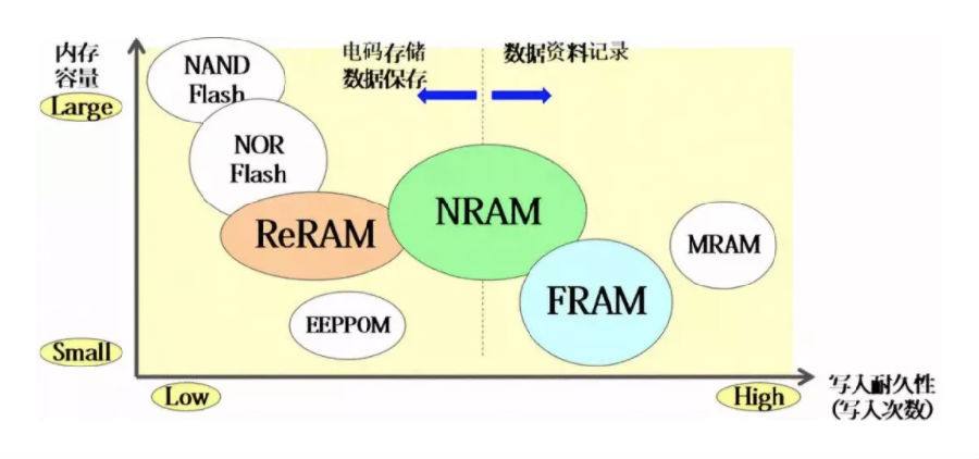 在新型内存方面,NRAM的竞争对手有许多新兴技术,它们将在速度、耐用度和容量方面挑战NAND闪存。例如,铁电RAM(FRAM)出货量相当高;IBM开发了赛道内存;英特尔、IBM和Numonyx都开始生产相变内存;自1990年代以来,磁阻内存(MRAM)一直在开发中;惠普和海力士在开发ReRAM也被称作忆阻器;英飞凌在开发CBRAM。