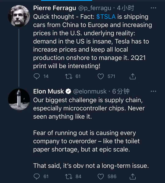 北京时间6月2日下午消息,特斯拉CEO马斯克在Twitter上表示:“目前我们最大的挑战是供应链,特别在控制器芯片方面,这种情况前所未有。”