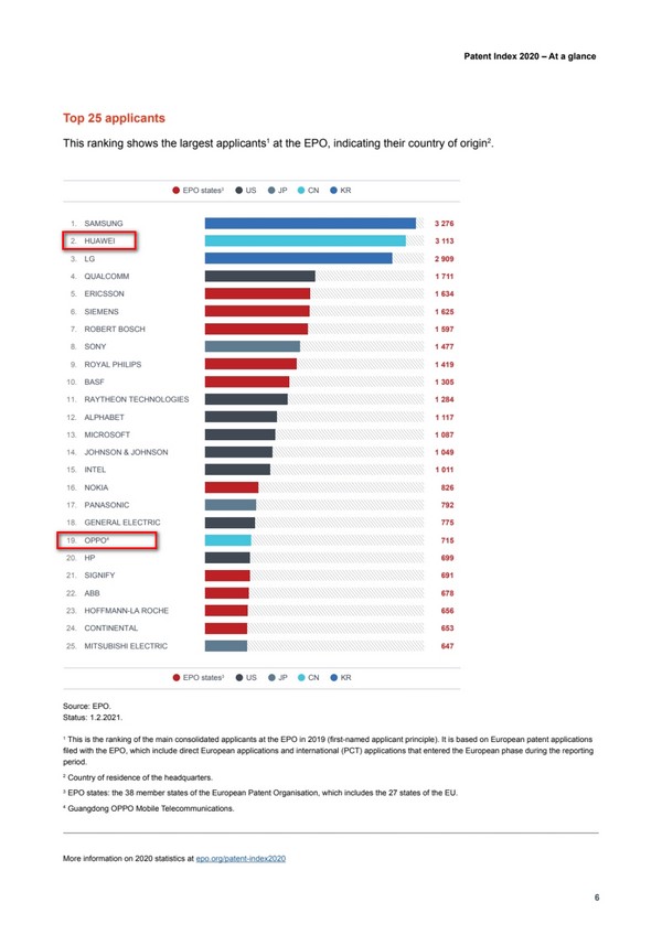 日前,欧洲专利局EPO公布了2020年 。 显示,2020年EPO共收到180250件申请,较2019年下降0.7%,或因受疫情影响导致。申请量Top25中,华为 第二,OPPO 19。