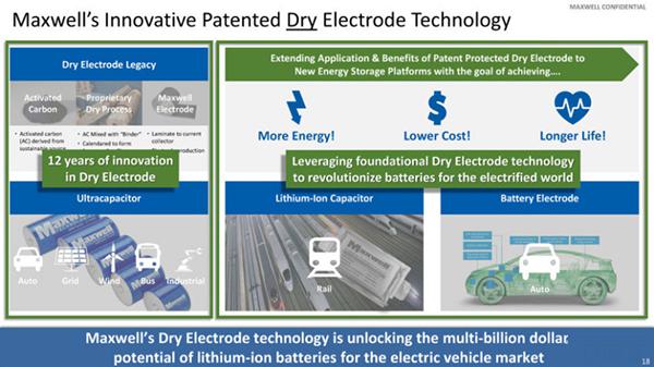 Maxwell 是业内知名的超级电容设计制造企业,除了研发超级电容技术之外,Maxwell 还致力于开发干电极技术,该公司曾表示该技术将有潜力成为电池行业的一项革命性技术,会在未来的电动汽车领域存在巨大的市场。