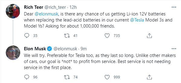 特斯拉CEO埃隆·马斯克在推特回复网友称,特斯拉将会尝试推出续航能力更佳的可替换电池。