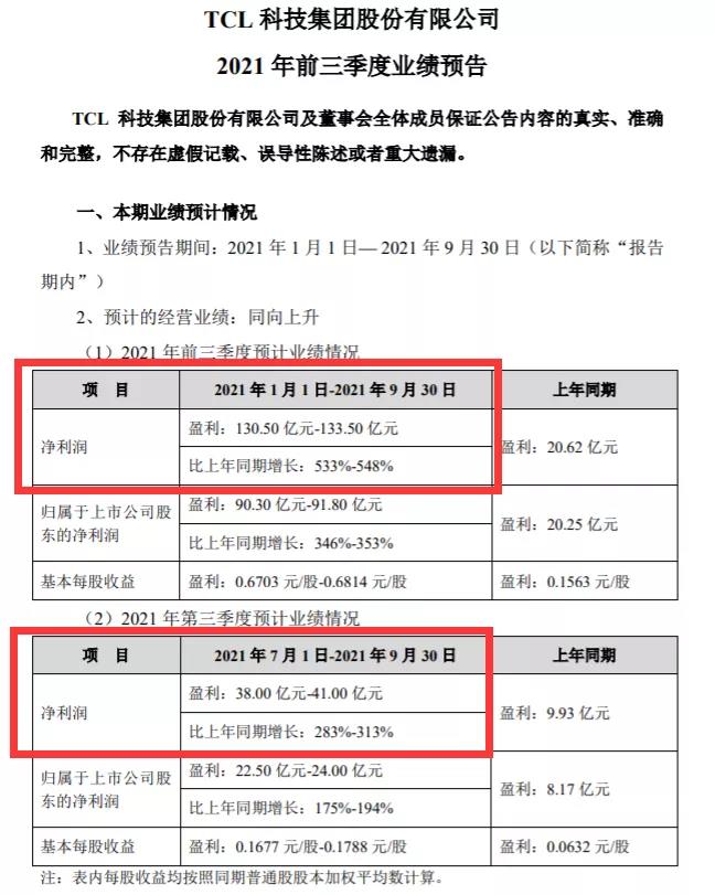TCL科技(000100.SZ)发布2021年前三季度业绩预告,公司预计实现净利润130.50 - 133.50亿元,同比增长533% - 548%;归属于上市公司股东净利润预计达90.30 - 91.80 亿元,同比增长346% - 353%。半导体显示业务前三季度实现出货面积同比增长超30%,净利润同比增长约16倍。