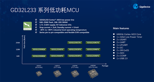 GD32L233系列MCU以多种运行模式和休眠模式提供了优异的功耗效率和优化的处理性能。与业界同类低功耗产品相比,具备更加丰富的外设资源和应用灵活性,从而为系统级能源效率的持续提升开辟道路,广泛适用于工业表计、小型消费电子设备、便携式医疗设备、电池管理系统、数据采集与传输等典型市场。GD32L233产品组合提供了4种封装类型共10个型号选择,目前已经开始提供样片和开发板卡,并将于11月正式量产供货。