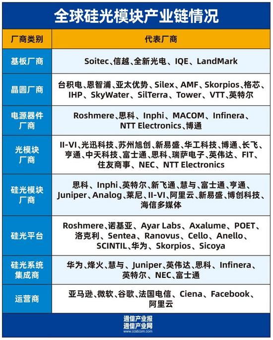 硅光技术市场前景广阔,近年来逐步成为资本整合的热门对象。据了解,思科先后收购了Lightwire、Luxtera、Acacia等硅光子公司,华为收购Caliopa,Juniper收购Aurrion,英特尔收购Barefoot,诺基亚收购Elenion,亨通则与英国洛克利合资成立新公司,也进军了硅光市场。