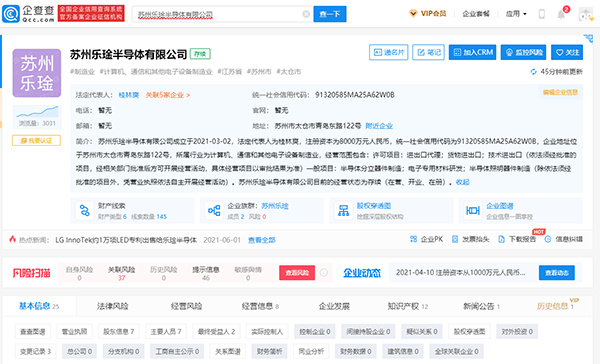 企查查显示,苏州乐琻半导体有限公司成立于 2021 年 3 月 2 日,注册资本 8000 万元人民币,经营范围包括进出口代理、技术进出口、半导体分立器件制造、半导体照明器件制造等,法定代表人桂林爽,实际控制人沈雁伟。此外,该公司还由太仓市政府国有资产监督管理办公室持股 31.9149%。