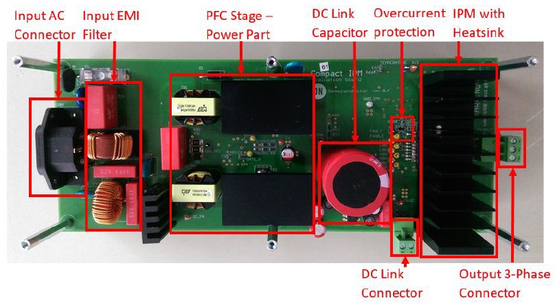 输入230Vac之850W电机驱动方案,具备功率因数调整器(Power Factor Correction)及EMI滤波电路;