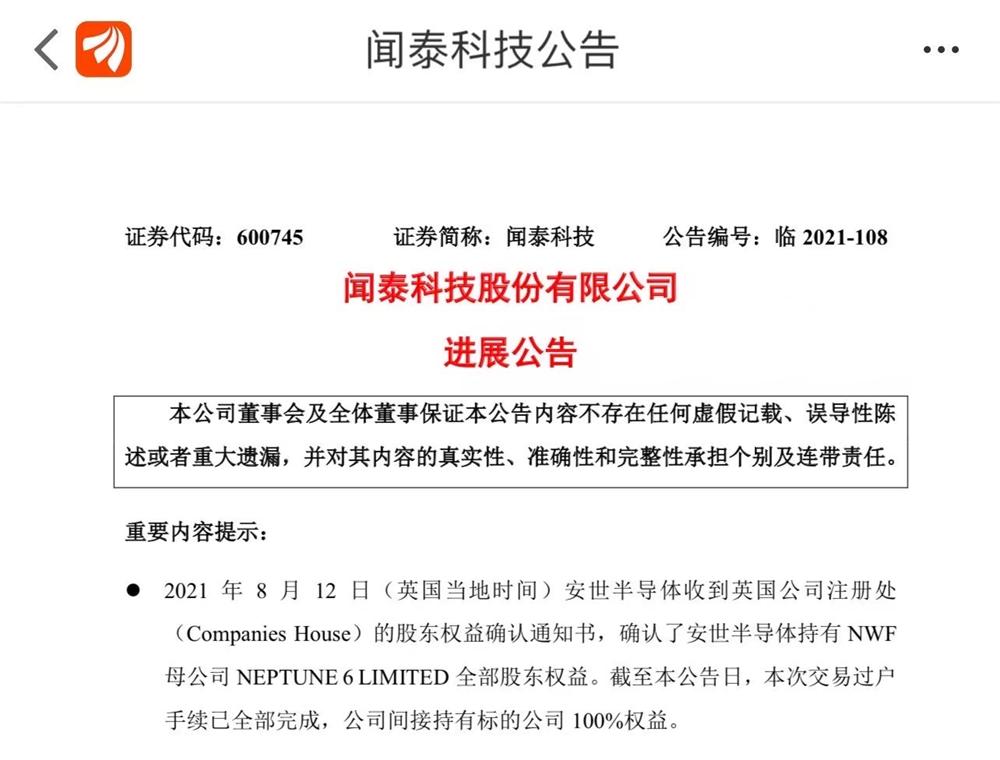 近日,闻泰科技发布公告,宣布公司全资子公司安世半导体已经完成了对英国最大晶圆制造商Newport Wafer Fab(英国新港晶圆厂)母公司NEPTUNE 6 LIMITED全部的100%股权收购。