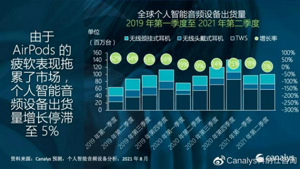 在连续几个季度均以两位数的势头强劲增长后,TWS 出货量似乎已达顶峰,增长率降至 6.4%,2021 年第二季度整体仅出货 5830 万台,创三年以来新低。2021 年第二季度,全球个人智能音频市场出货量达 9980 万台,整体增长 4.7%。作为个人智能音频市场的领导者,苹果的增长率首次出现下滑,并呈现出放缓迹象。AirPods TWS 设备的出货量在 2021 年第二季度下降了 25.7%,降至 1500 万台,导致本季度整个 TWS 市场的增长低于往常。