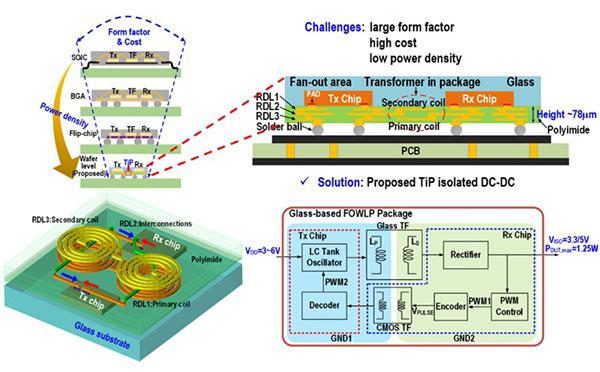 与传统隔离电源芯片相比,该研究基于利用先进的玻璃扇出型晶圆级封装技术,将接收和发射芯片通过封装上可再布线层制成的微型变压器进行互联封装,不需要额外的变压器芯片,克服了现有芯片设计中需要三颗甚至四颗芯片的缺点从而大大提高了隔离电源的转换效率和功率密度。