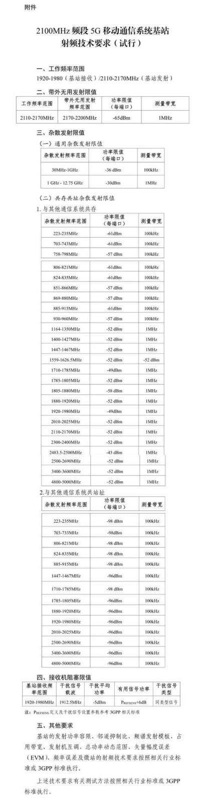为满足5G应用需求,保障我国2100MHz频段5G移动通信系统与其他无线电业务的兼容共存,依据《中华人民共和国工业和信息化部公告2015年第80号》《中低频段5G系统设备射频技术要求的通知》(工信部无〔2020〕87号),工业和信息化部无线电管理局研究制定了《2100MHz频段5G移动通信系统基站射频技术要求(试行)》。