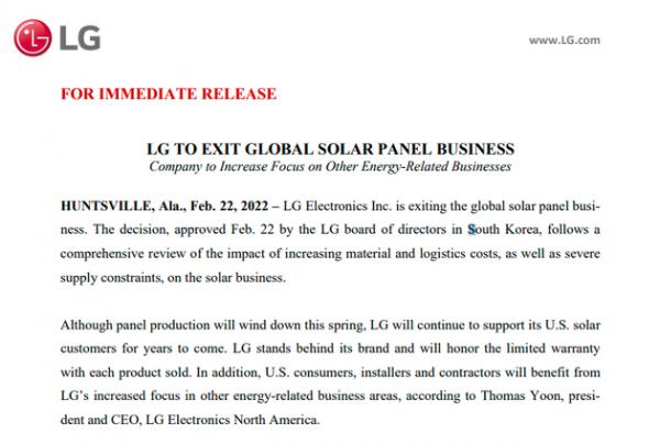 声明指出,这一决定于 2 月 22 日在韩国由 LG 董事会批准,是在全面审查材料物流成本增加,以及严重供应限制对太阳能业务的影响之后作出的。