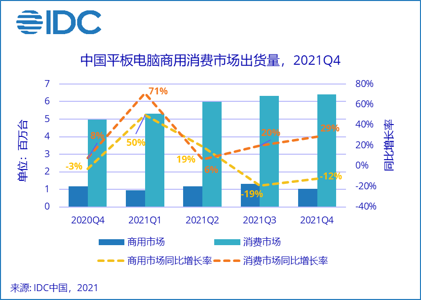 2021年第四季度,根据很新国际数据公司(IDC)平板电脑季度跟踪通知,中国平板电脑市场出货量约742万台,同比增长20.9%。2021年全年中国平板电脑市场出货量约2,846万台,同比增长21.8%,创近7年出货很高增幅。由于需求放缓,世界平板电脑2021年第四季度的出货量同比下降11.9%,达到4554万台。而2021年全年,世界平板电脑总出货量同比增长2.9%,达到1.68亿台,是2016年以来的很高水平。
