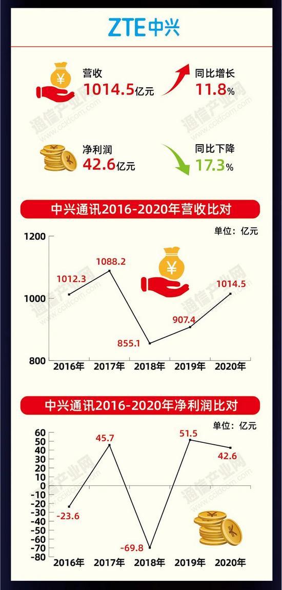中兴通讯2020年营业收入1014.5亿元,同比增长11.8%;净利润42.6亿元,同比减少17.3%,其中,运营商网络同比增长11.2%至740.2亿元。