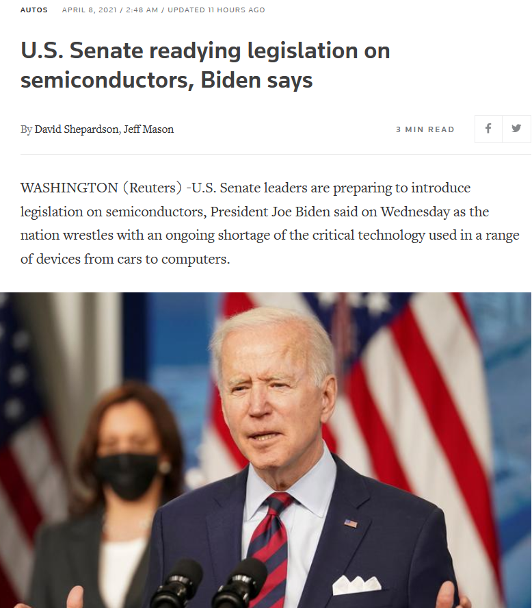 据路透社报道,鉴于美国正面临从汽车到电脑等诸多行业使用的关键半导体持续短缺的困境,为了解决这一问题,美国总统Joe Biden在周三表示,美国参议院领导人正准备制定有关半导体的法案。